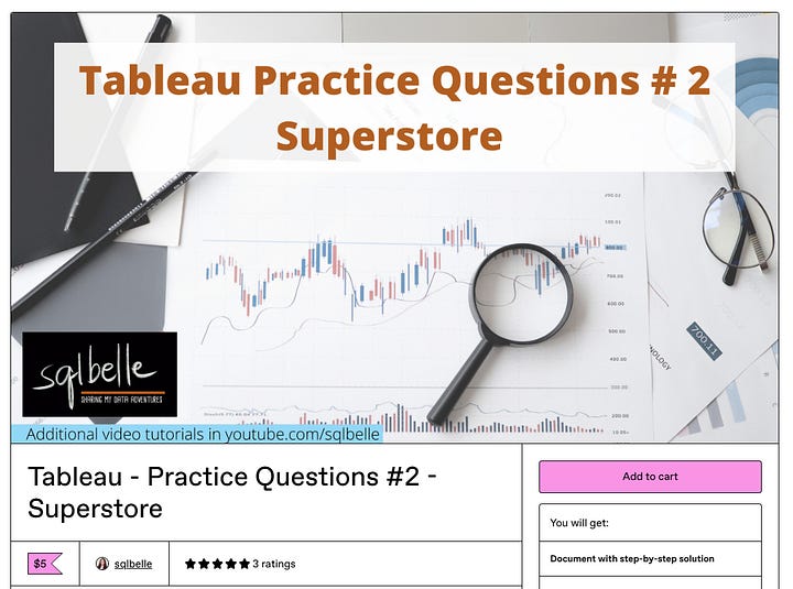FREE Resources(YouTube) - sqlbelle - Learn SQL and Tableau Tableau Practice Questions (for interview and certification prep)Weekly Newsletter - data tidbits