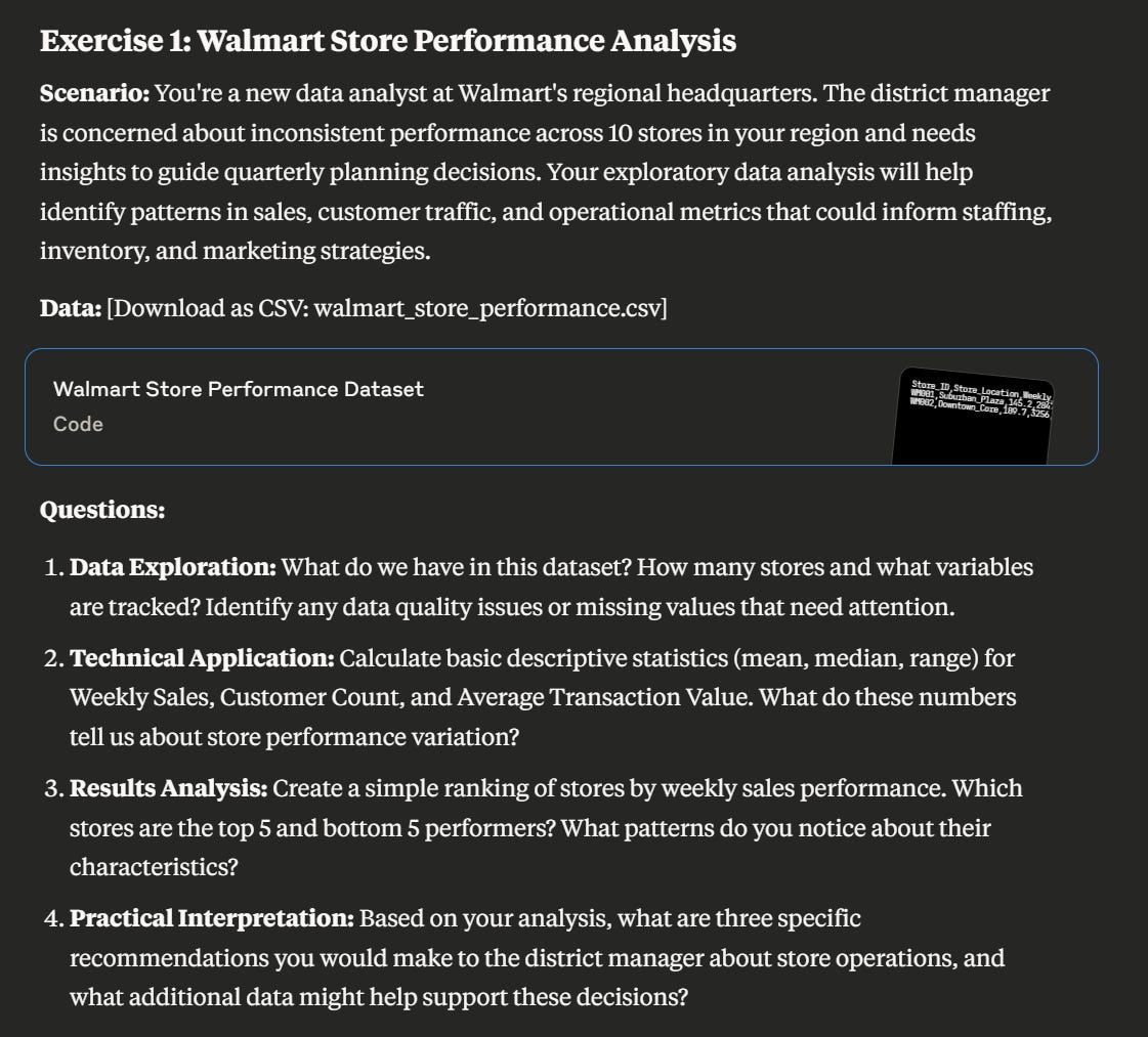 [continues for 100 realistic records with missing values and outliers]Exercise 1: Walmart Store Performance Analysis